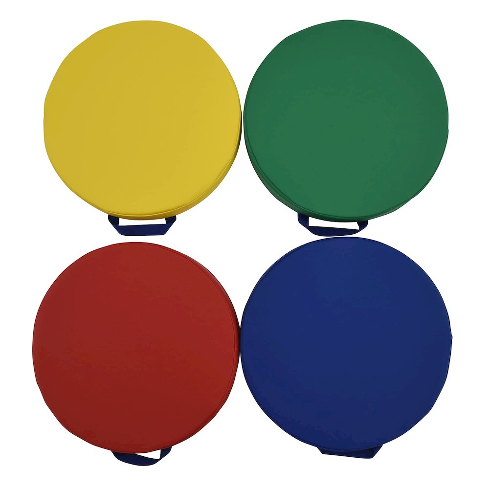 These colorful cushions give students a comfortable place to sit during story time playtime or any floor activity. The 2" thick soft foam cushions feature a durable wipe-clean cover and carrying handle. Each set has one round floor cushion in blue, red, yellow and green.