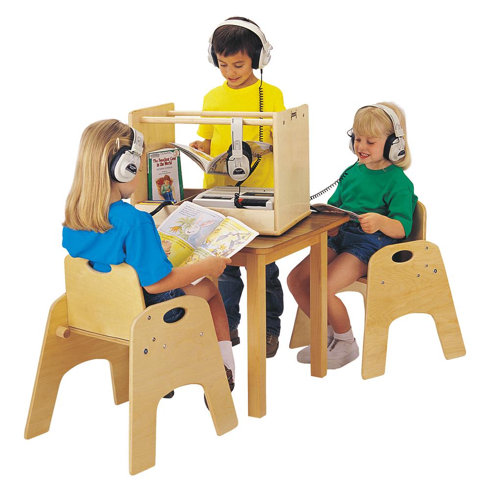 Portable listening center. Holds audio player, eight headphones, with partitions for books, CDs or cassette tapes. Birch and maple construction.