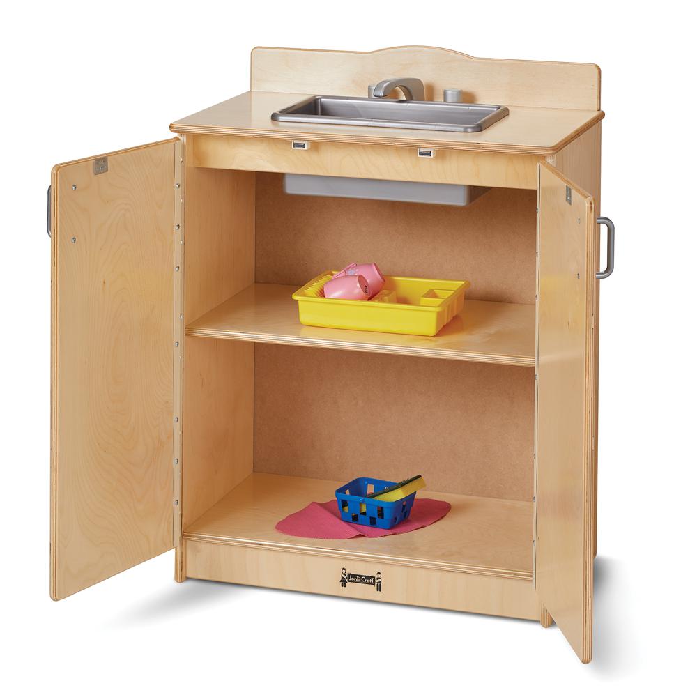 Sized just for elementary-aged children and after school programs, this sink provides realistic play with wooden turn-button controls and a swivel faucet. Magnetic catches help keep doors closed while chrome-looking handles and faucet provide a high-end a