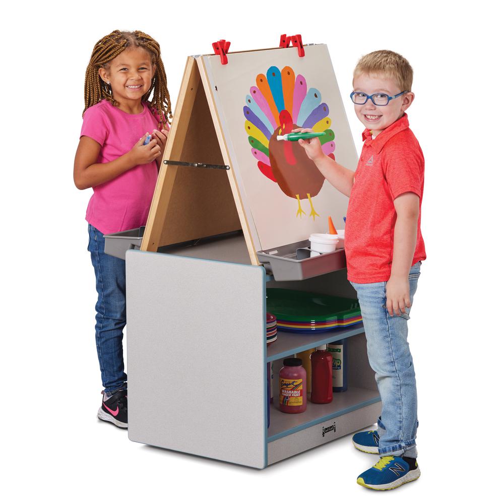 Foster artist creativity for two children and keep art supplies within children's reach. Write-n-Wipe easel panels are standard, but Acrylic and Chalkboard panels are optional. Clips and paint trays included. Constructed of double-sided freckled gray laminate with coastal blue TRUEdge.