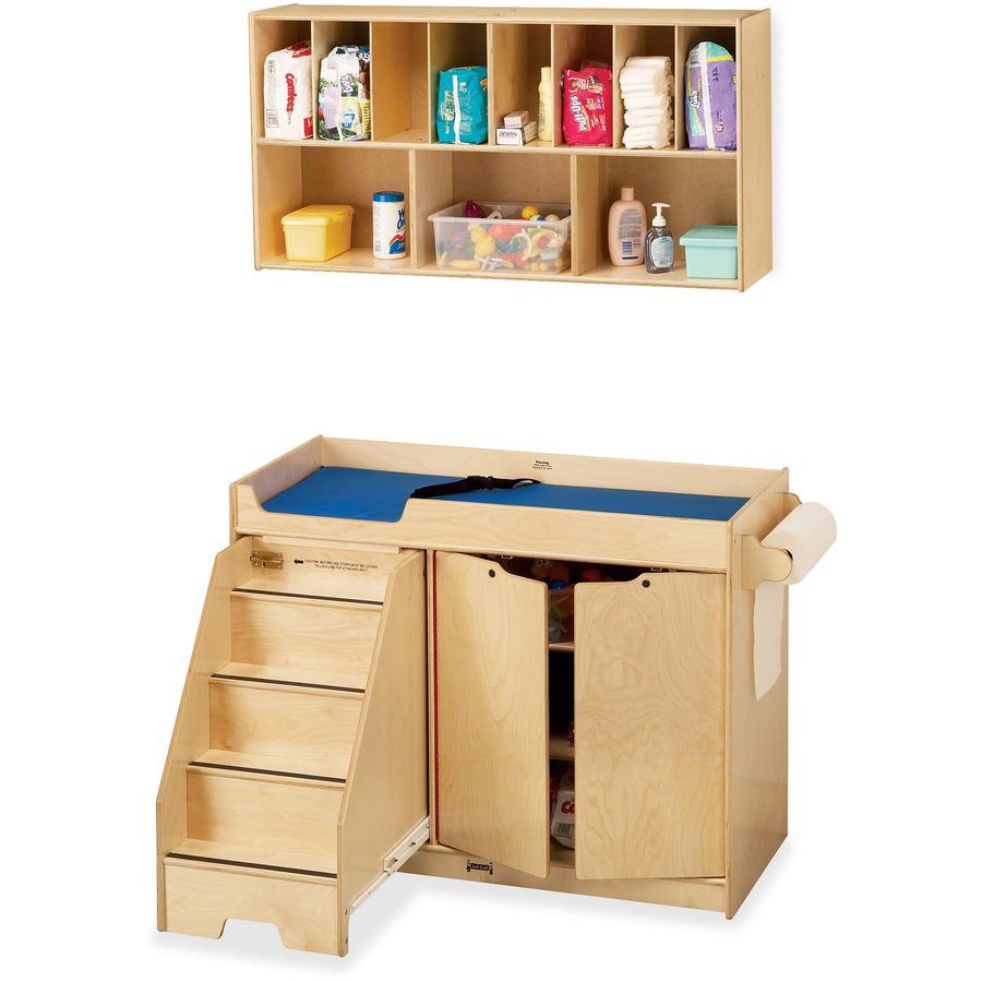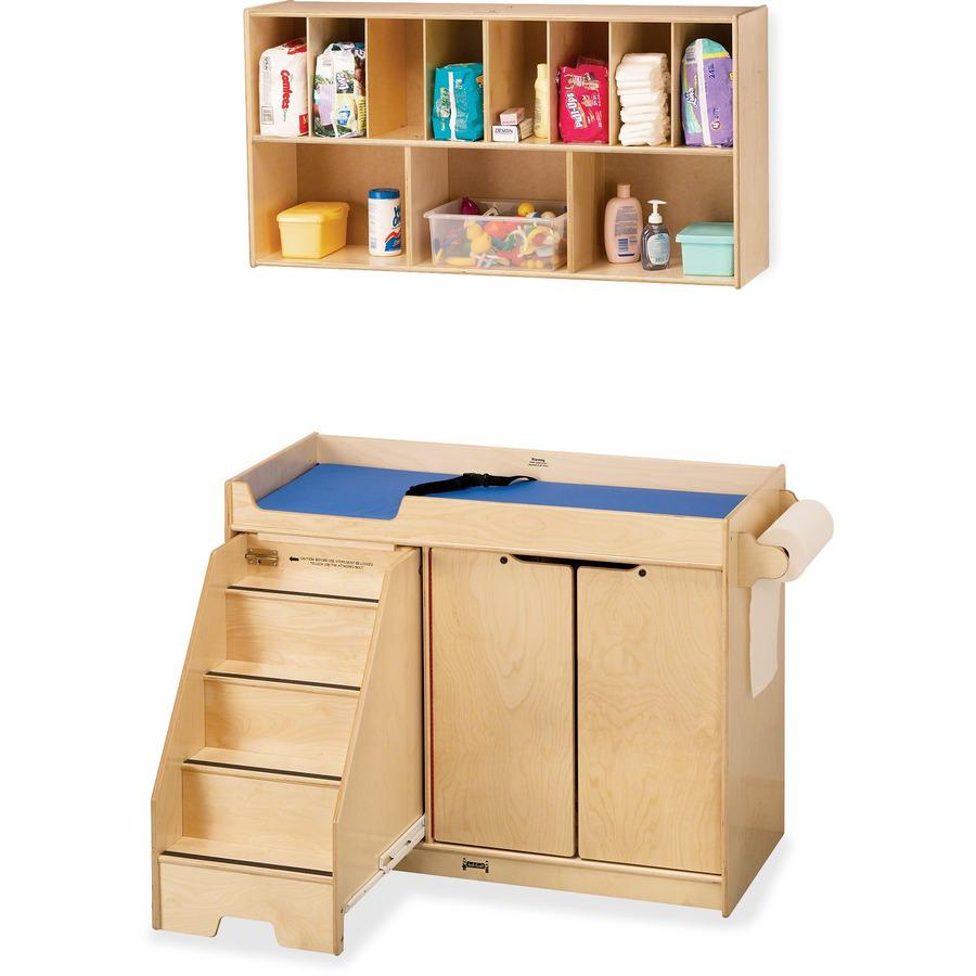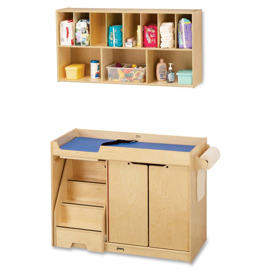 Diaper organizer provides convenient, wall-mounted storage for your diapering necessities. Organizer can be installed above the changing table to provide a complete changing station. KYDZSafe rounded edges allow children to play safely without getting hurt by sharp edges or corners. Dowel-pin construction prevents weakening at the joints, where most of the stress occurs. Ultraviolet acrylic coating is durable and resists yellowing over time.
