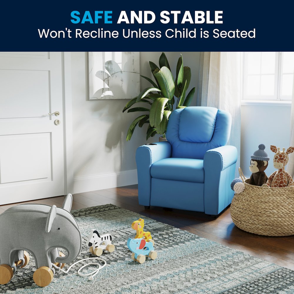 Contemporary Light Blue Vinyl Kids Recliner with Cup Holder and Headrest