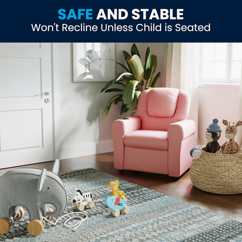 Contemporary Pink Vinyl Kids Recliner with Cup Holder and Headrest
