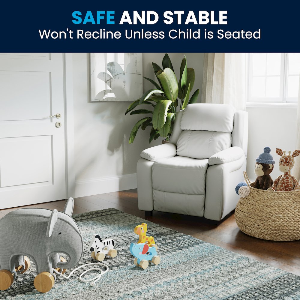 Deluxe Padded Contemporary White Vinyl Kids Recliner with Storage Arms