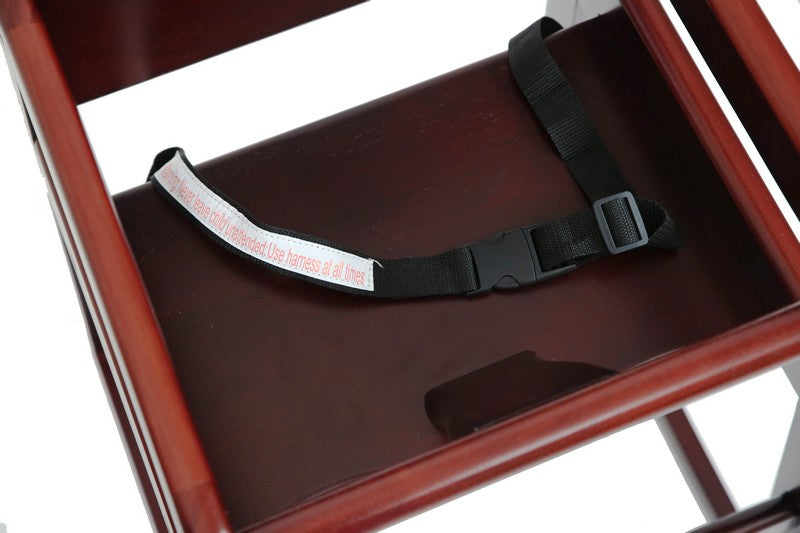 L.A. Baby Commercial Grade Solid Wood High Chair - Have the convenience of a restaurant style high chair in your home without flagging down the wait staff. The L. A. Baby high chair has smooth radius corners and fits flush to standard table heights so feeding time is easy and convenient! Made of solid wood, with a wide sturdy base and in a beautiful cherry finish that matches almost any décor. This high chair is designed for use with toddlers and the manufacturers suggested maximum weight capacity is 40.0 Lbs. Safety belt with solid wood crotch restraint.